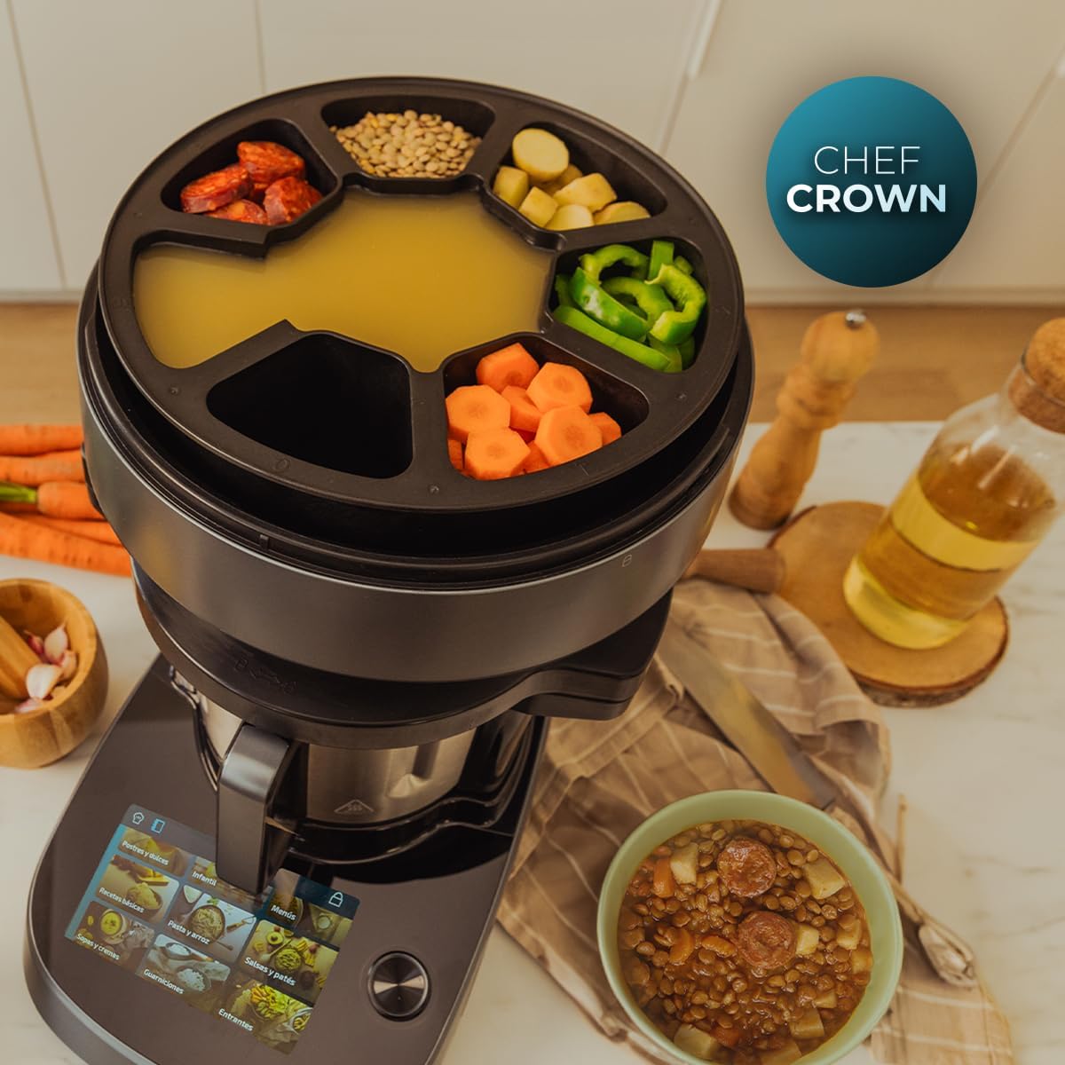 Écran tactile avec livre de recettes intégré. Capacité totale de 4,5 L (3,2 L de capacité utile).